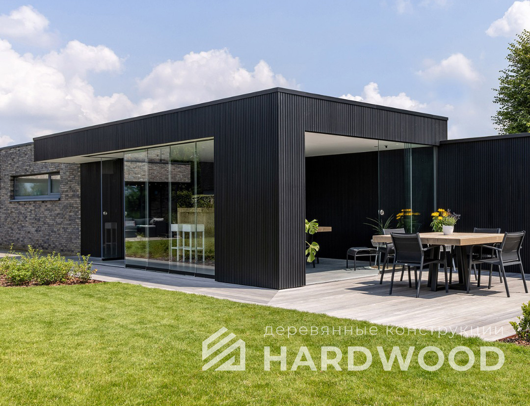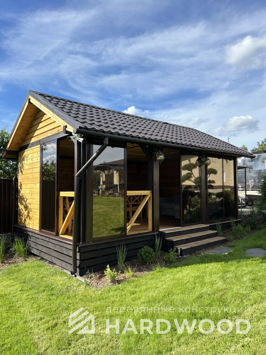 Лофт вырос из индустриальной эстетики: прямые линии, понятный каркас, фактура материалов на первом плане. В беседке это выражается в открытых балках, строгой геометрии, крупном остеклении и функциональности каждой детали. Никакой визуальной «тяжести» — только то, что работает на комфорт и стиль.